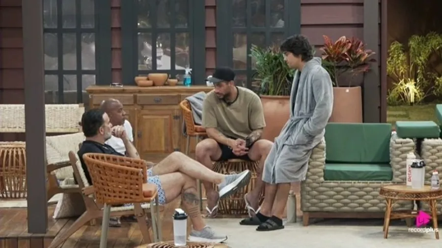 Nizam se queixa de Gaby em conversa com Guilherme Boury, Toninho Tornado e Fabiano Moraes em “A Fazenda” • Reprodução/Record