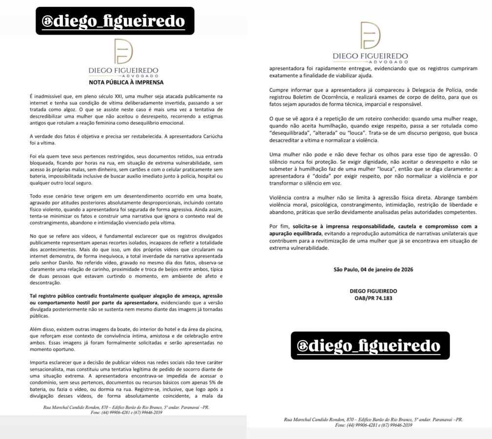 A apresentadora Cariúcha, 42, publicou nas redes sociais neste domingo (4), uma nota oficial sobre o caso em que denunciou uma suposta agressão de seu affair, o médico Danilo Bravo, em Balneário Camboriú, Santa Catarina.