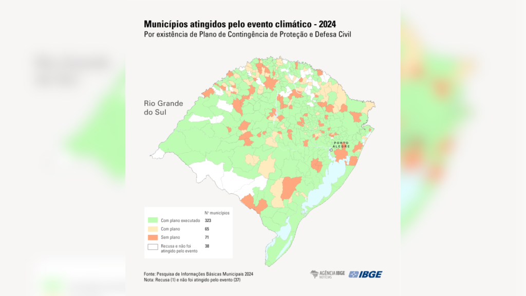 A MUNIC 2024 (Pesquisa de Informações Básicas Municipais) mostram que dos 497 municípios do estado, 459 foram atingidos pelas chuvas, um total de 92,4%.
