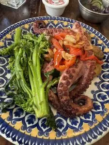 Para o prato principal, seguindo a indicação do Chico, um grande clássico da gastronomia mediterrânea: Polvo a Lagareiro. Ponto de cozimento e tempero minimalistas, na verdadeira tradução da “aurea mediocratis”. O belo polvo (foto) veio guarnecido de brócolis cozidos ao vapor e batatas ao murro: simplesmente fenomenal.
